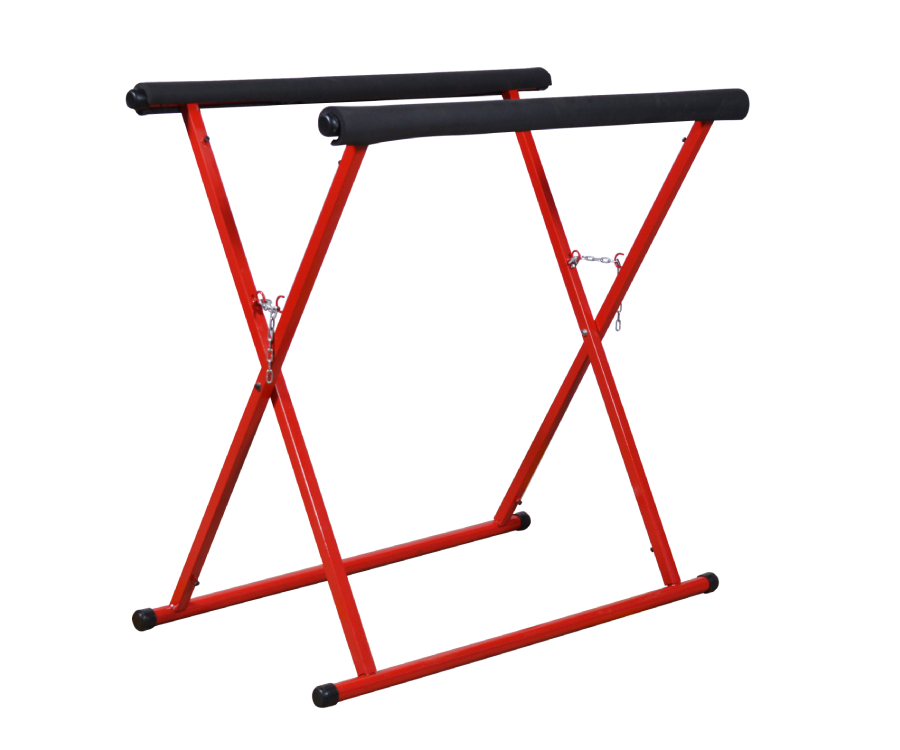 Very sturdy steel trestle stand with foam rubber protection strips.