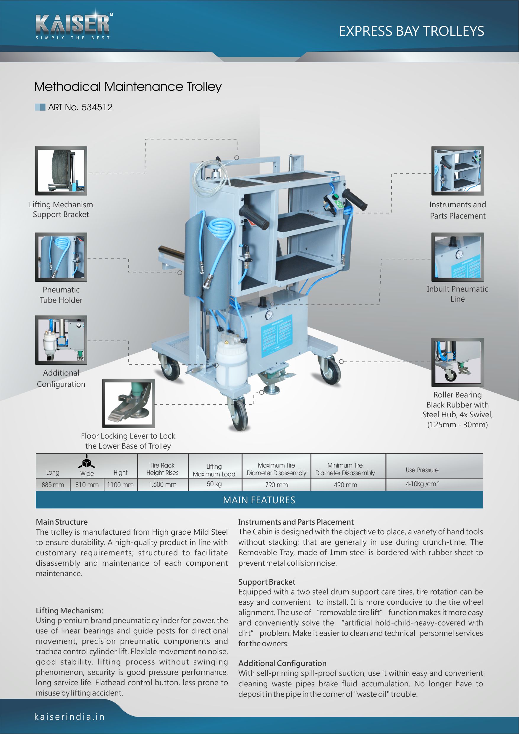 Kaiser's "METHODICAL Maintenance Tools Trolley" has a unique tire lifter, which is conducive to cracking the danger of unstableness resulting from lifting the tire by bare hands during the tire installation and dismantle so; as to ensure safety in automobile service. It is equipped with negative pressure setups which can increases the operational safety. All the necessary tools used in the test and service can be put on the trolley, it saves time by approx 45 minutes.