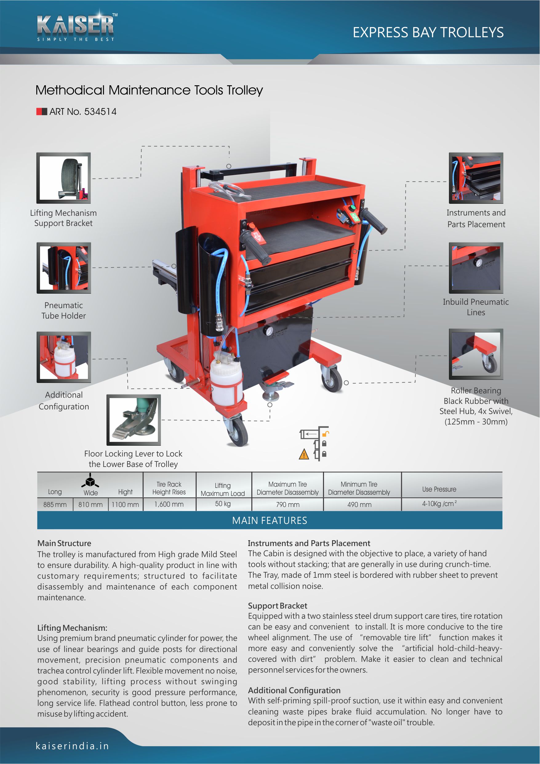 Kaiser's "METHODICAL Maintenance Tools Trolley" has a unique tire lifter, which is conducive to cracking the danger of unstableness resulting from lifting the tire by bare hands during the tire installation and dismantle so; as to ensure safety in automobile service. It is equipped with negative pressure setups which can increases the operational safety. All the necessary tools used in the test and service can be put on the trolley, it saves time by approx 45 minutes.