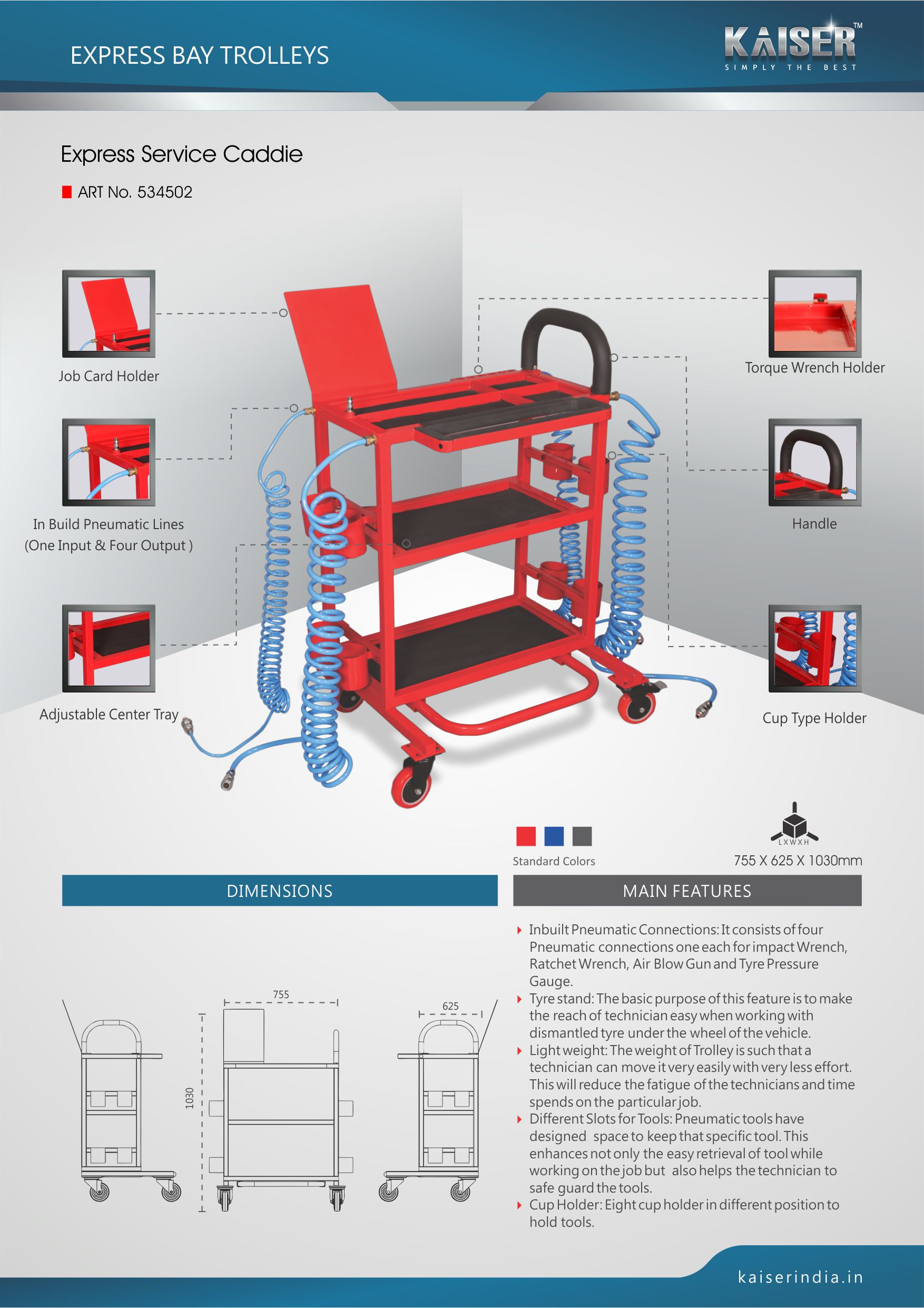 Light weight: The weight of Trolley is such that a technician can move it very easily with very less effort. This will reduce the fatigue of the technicians and time spends on the particular job.